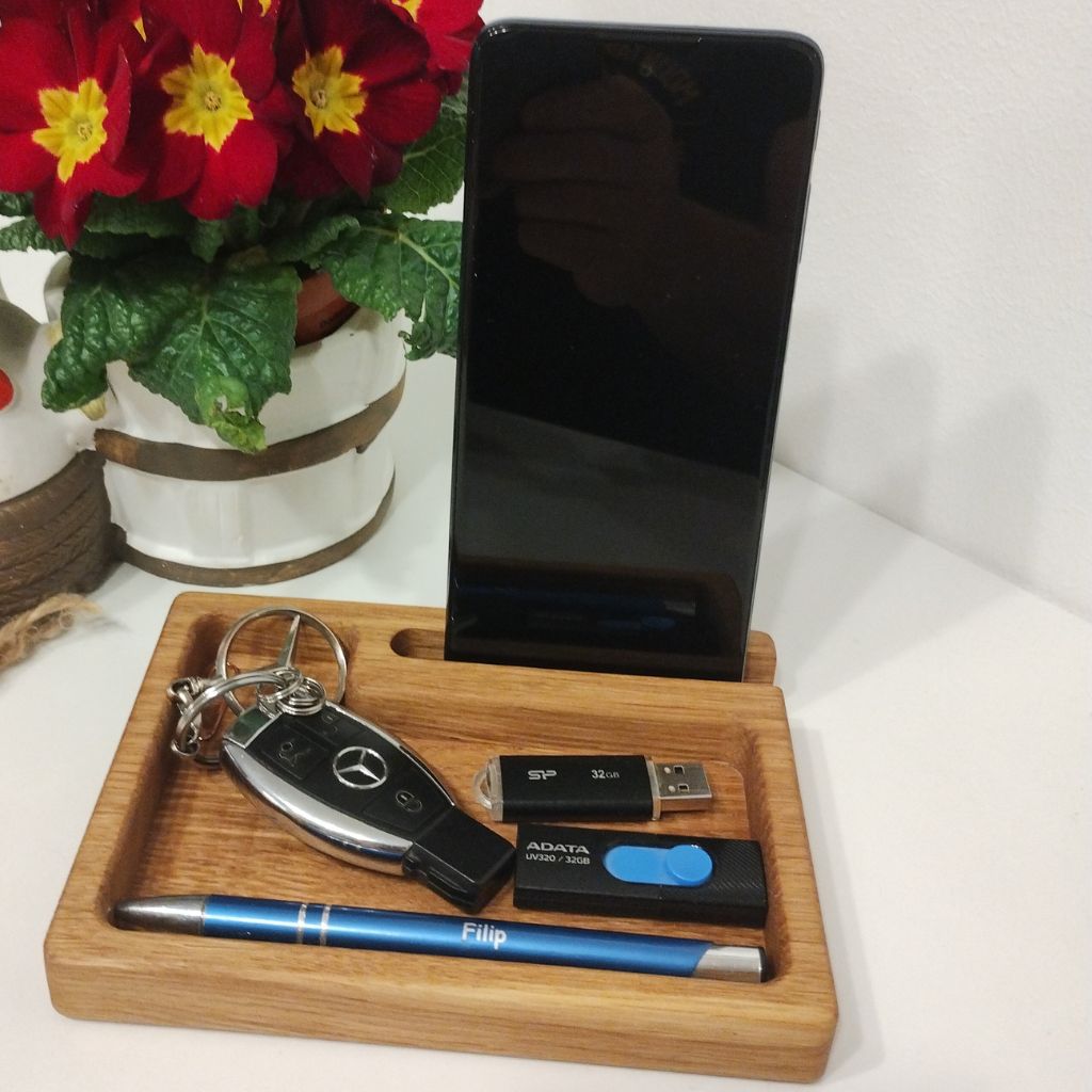 Dřevěný stojánek na mobil s odkládací plochou je univerzální dárek, který využije úplně každý. Usnadní videohovory, práci u počítače a navíc skvěle organizuje prostor na stole.