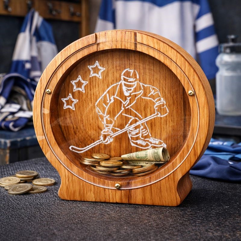 Jedním z oblíbených řešení je personalizovaná dřevěná pokladnička pro sportovce s gravírovaným hokejistou na předním plexiskle. Nejde jen o dekoraci do pokoje – je to praktický a osobní dárek, který dítě skutečně využije.