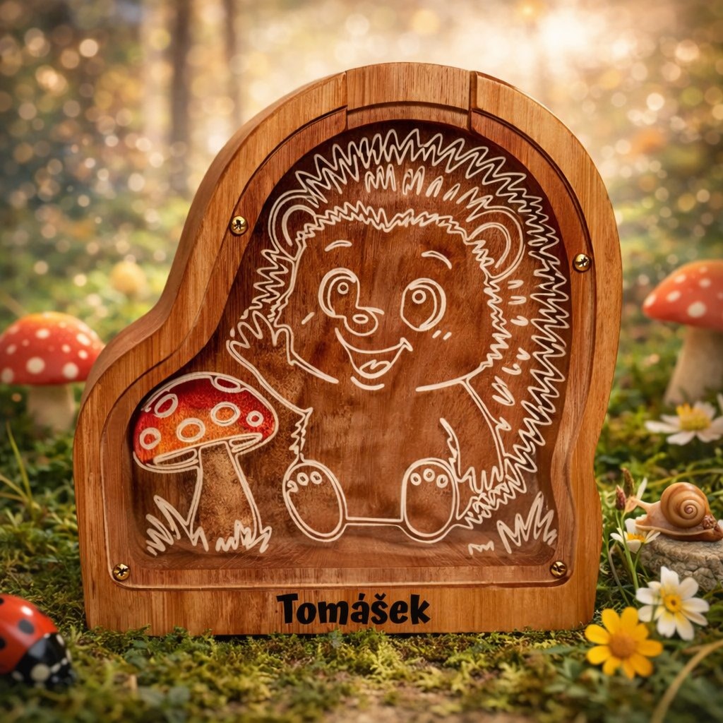 Dřevěná pokladnička ve tvaru ježka se jménem dítěte krásně spojuje příběh z přírody s praktickým využitím. Dítě si tak může ukládat své první úspory podobně jako ježek sbírá zásoby na zimu 🦔