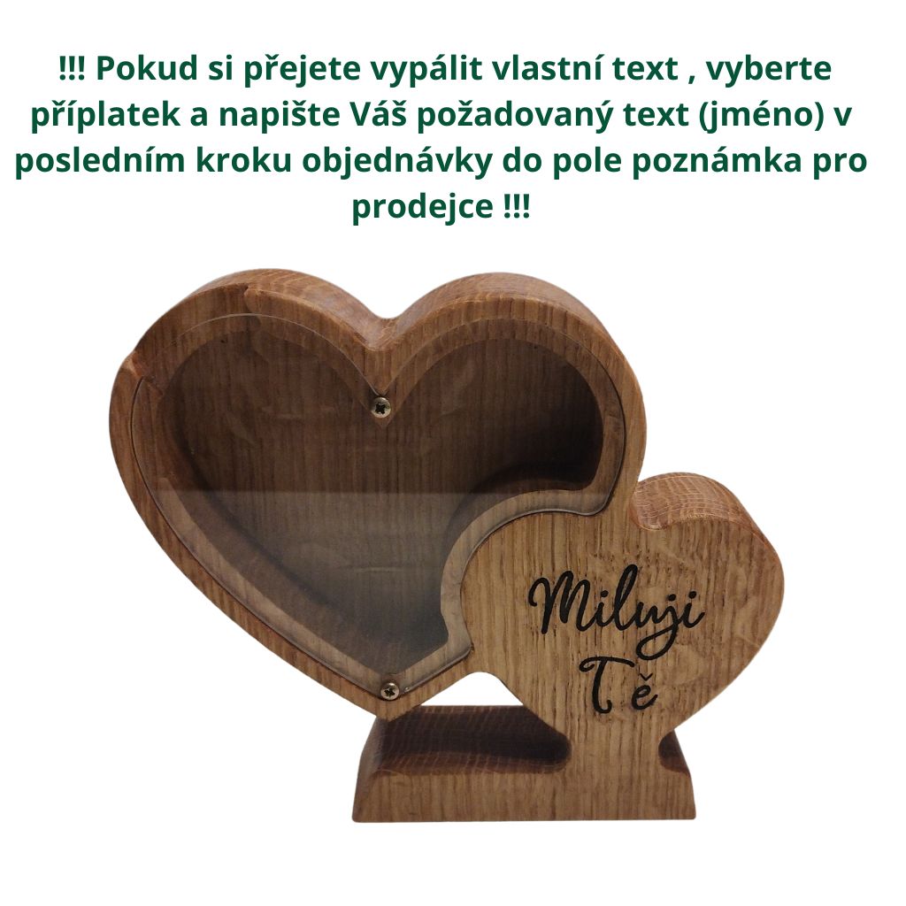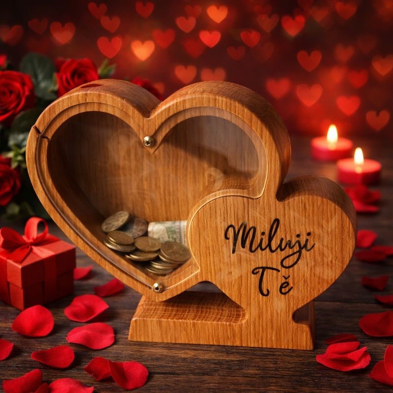 Osobní věnování, vlastní text nebo třeba dřevěná pokladnička ve tvaru srdce s vlastním nápisem dokáže vytvořit mnohem silnější emoci než běžný dárek.