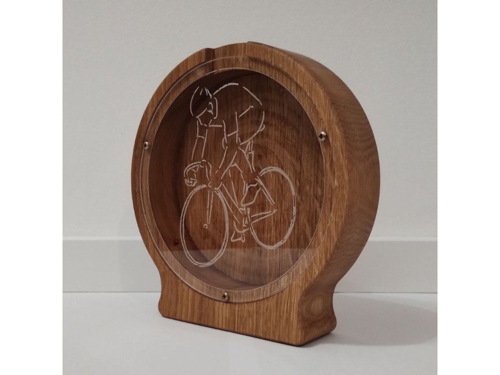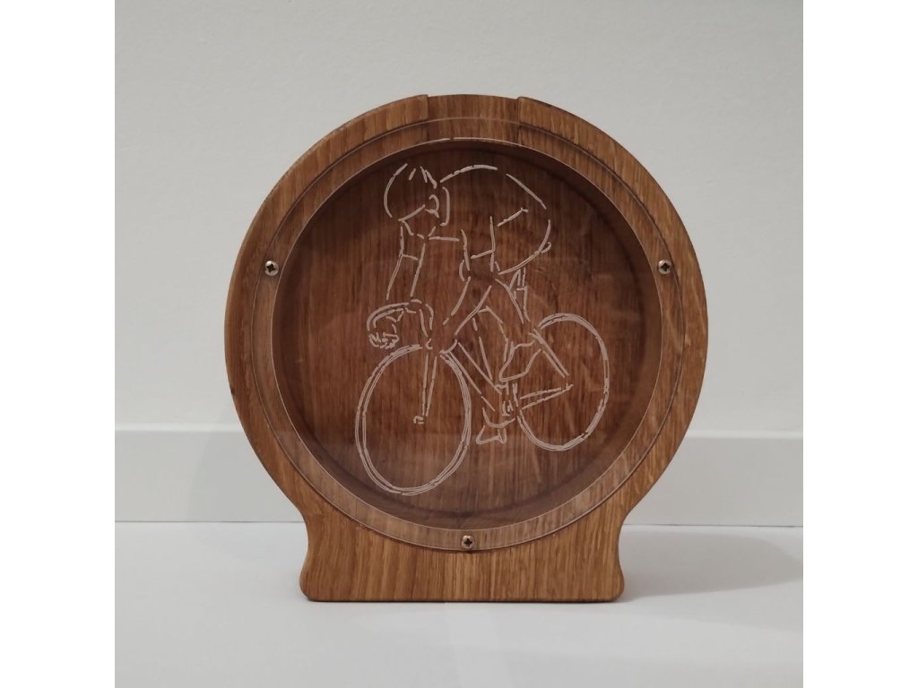 Naše dřevěná pokladnička pro cyklisty spojuje precizní řemeslné zpracování s osobním přesahem. V přední části je motiv cyklisty při jízdě, vygravírovaný do čirého plexiskla – detail, který potěší každého milovníka kol. Pokladnička tak není jen praktická, ale i dekorativní. Je ideální jako dárek pro cyklistu, který si rád odkládá na nové vybavení nebo cyklo výlet snů.