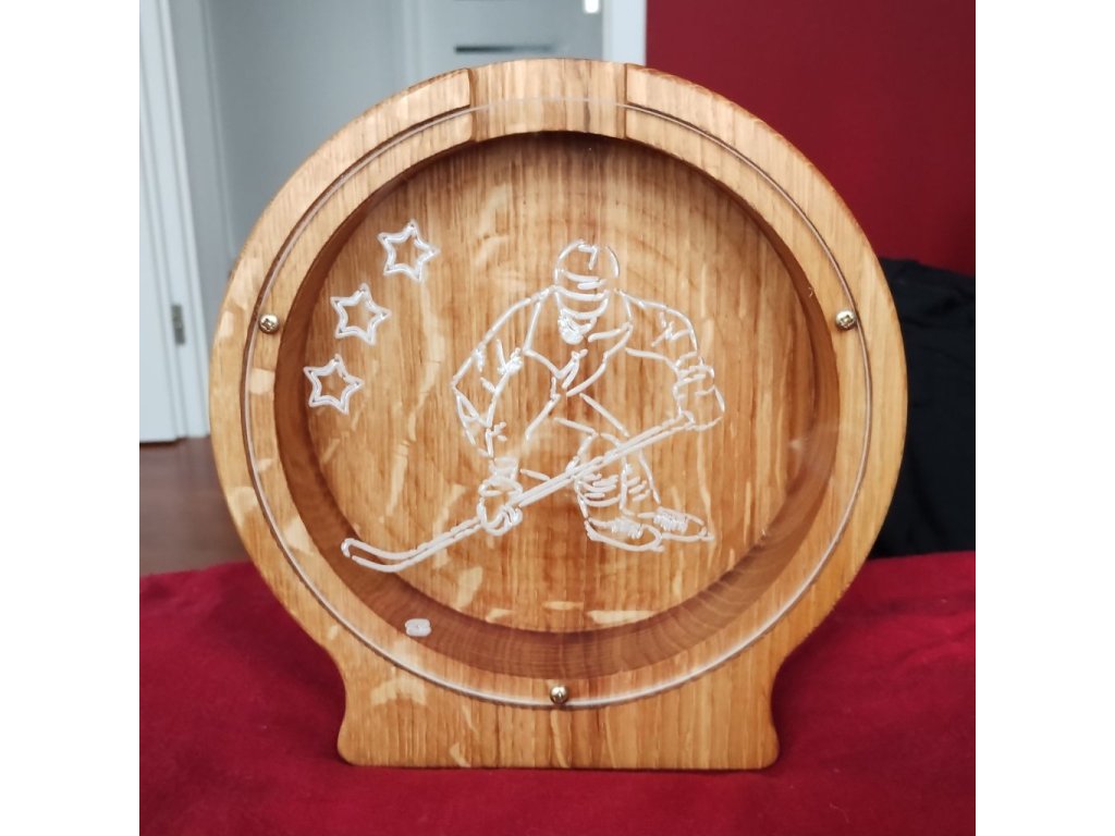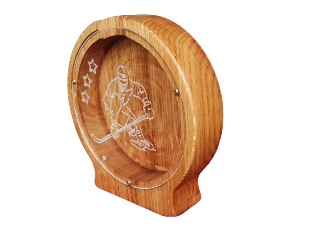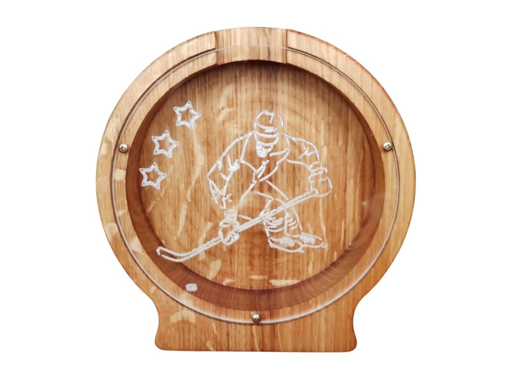 Hledáte originální dárek pro hokejistu, který má styl a smysl? Tahle ručně vyráběná dřevěná pokladnička se jménem potěší malé i velké fanoušky hokeje. Na přední straně z čirého plexiskla je vygravírovaný motiv hokejisty, díky kterému je na první pohled jasné, komu kasička patří. 💪🏒