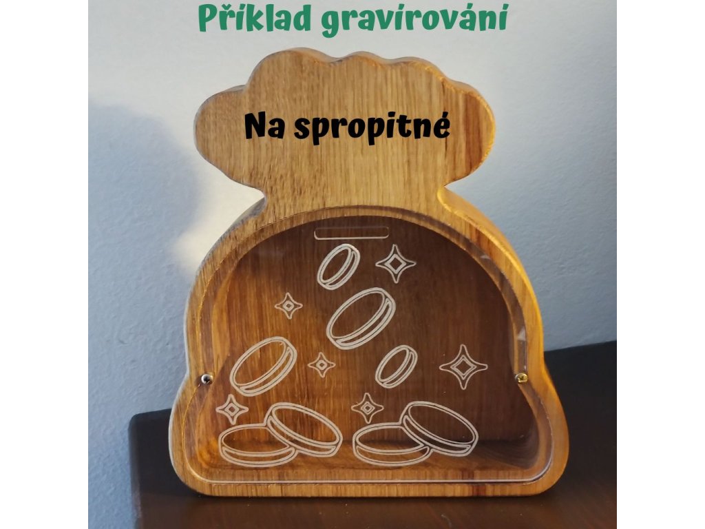 Dřevěná pokladnička na peníze ve tvaru měšce