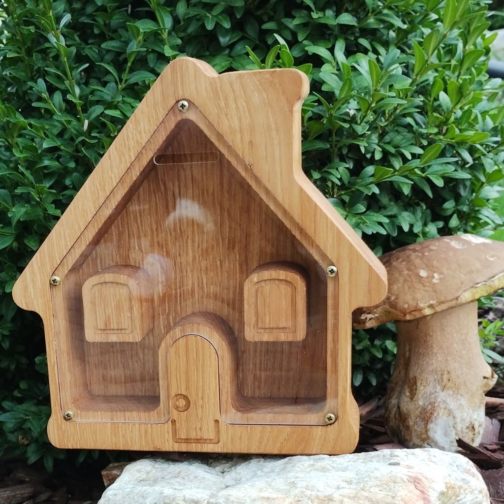 Ručně vyráběné z masivního dubu, se šroubovaným systémem a pevným plexisklem. Pokud tedy hledáte pokladničku, která je „nedobytná” pro děti i zvědavce, ale vy se do ní stále dokážete dostat – jen ne úplně hned – pak jste na správném místě.