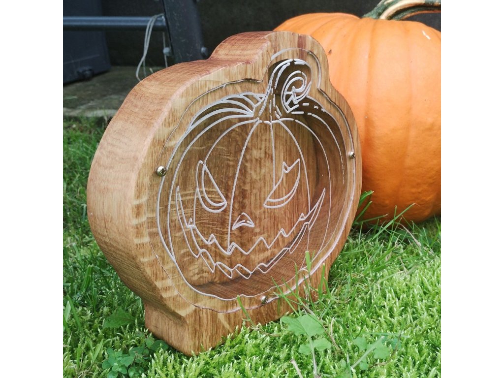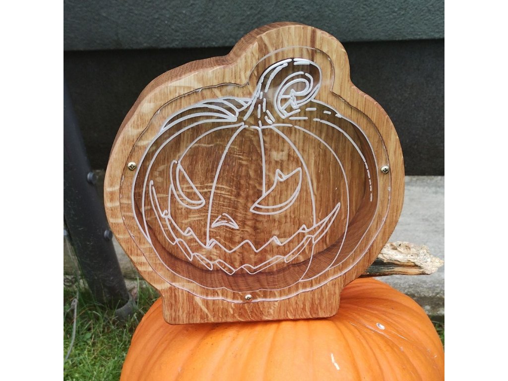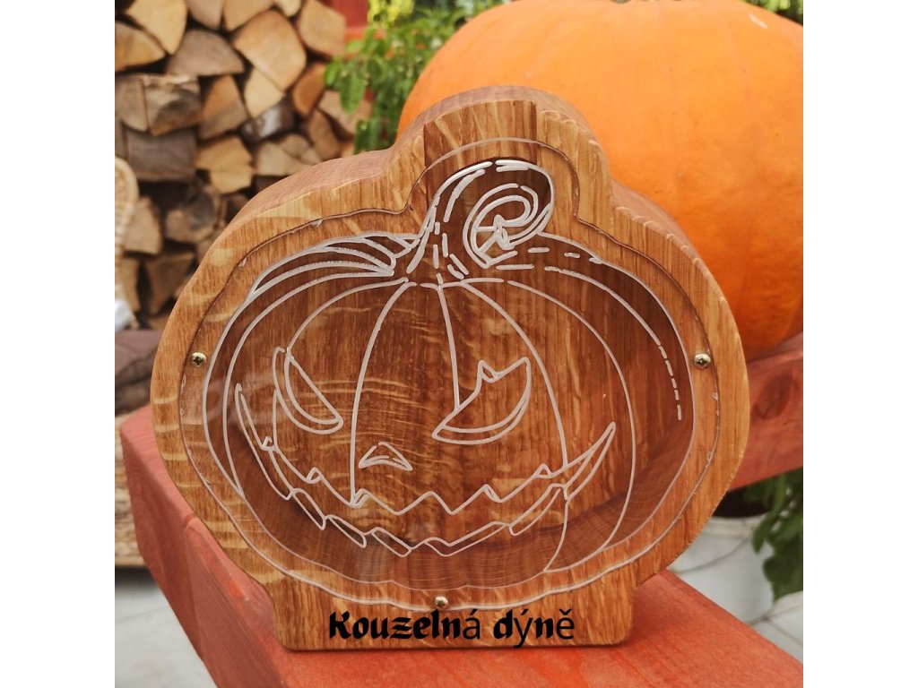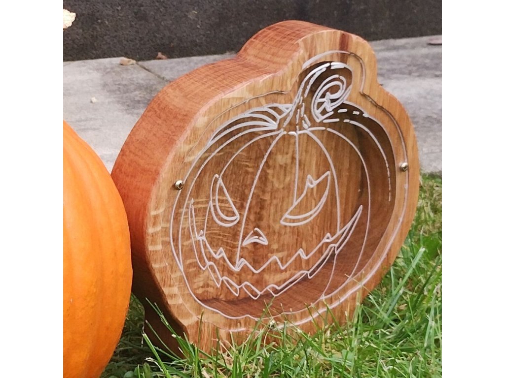 Veselá hallowenská dekorace do bytu - pokladnička ve tvaru halloweenské dýně přinese do dětského pokoje i obýváku nejen úsměv, ale i praktické využití. Ručně vyráběná z kvalitního masivního dřeva, ošetřená přírodními oleji a vosky, aby si zachovala svou krásu a odolnost po dlouhá léta. Ideální pro děti, které se učí spořit, i dospělé, kteří hledají netradiční dekoraci do bytu s užitkem.
