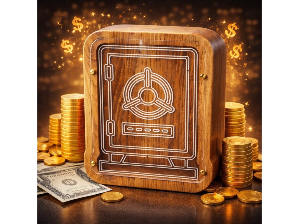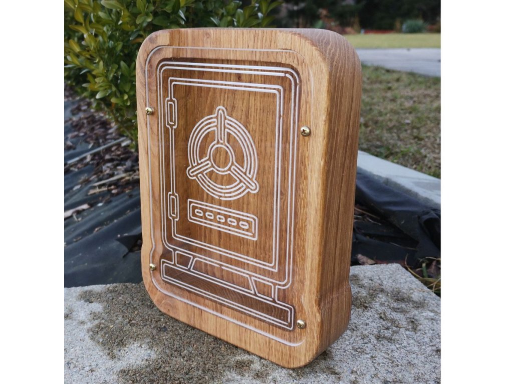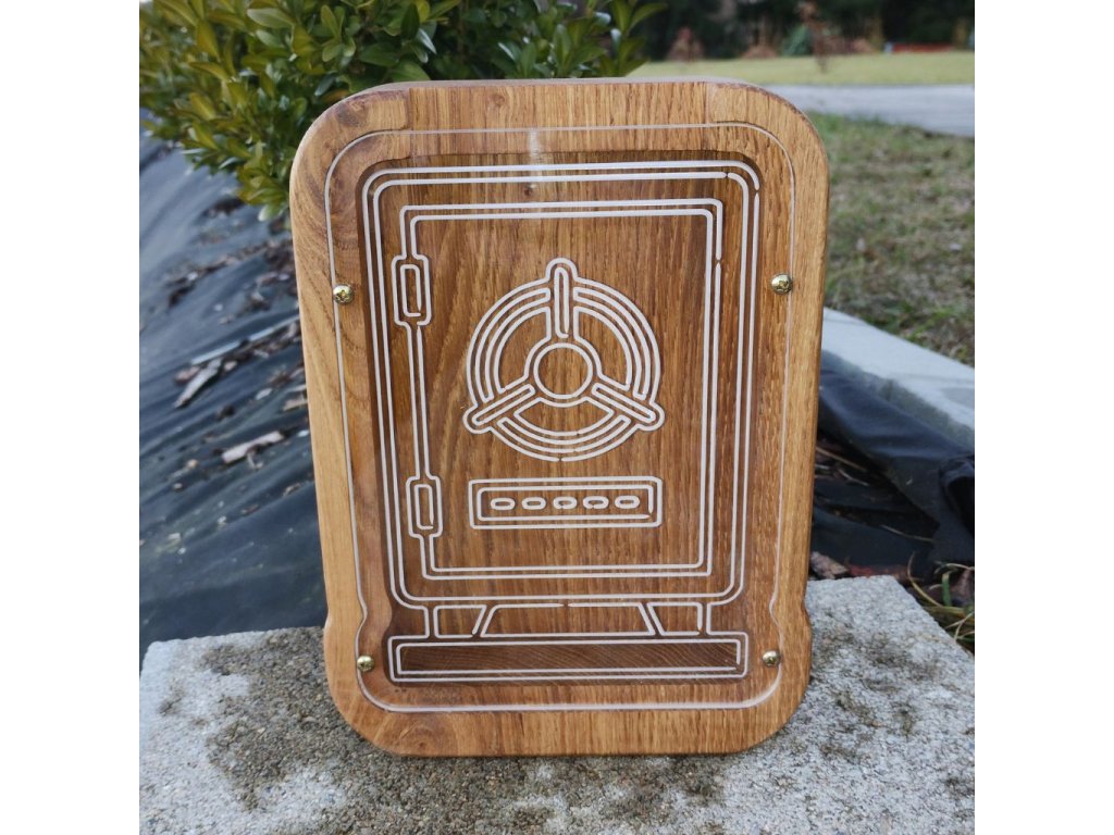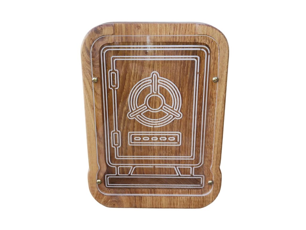 Pokladnička trezor je vyrobena z kvalitního dřeva a na přední straně má precizně vygravírovaný motiv klasického trezoru. Nejedná se o skutečný bezpečnostní trezor, ale o stylovou kasičku trezor, která dětem hravou formou pomáhá učit se hospodařit s penězi.