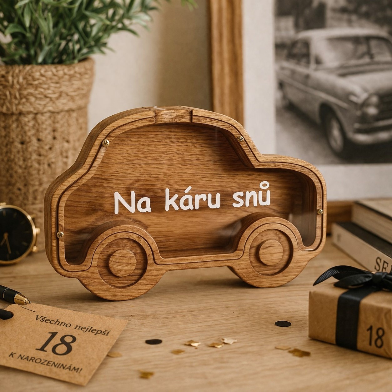 Pro každého kluka, který miluje auta, motorky nebo závody, je pokladnička ve tvaru auta perfektní volbou. Kombinuje jednoduchý, ale hravý design s praktickým využitím. Navíc můžeme doplnit jméno dítěte nebo krátký vzkaz.