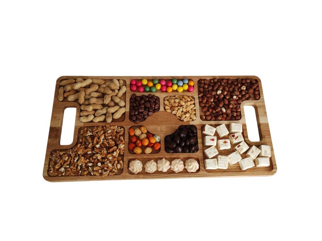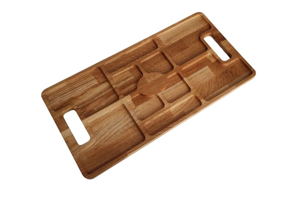Servírovací tác z kvalitního dubového dřeva je praktickým i stylovým doplňkem pro každé stolování. Díky rozdělení na 10 sekcí umožňuje přehledné servírování pochutin, dezertů, oříšků, ovoce nebo drobného občerstvení. Tento dřevěný servírovací tác je ideální pro rodinné oslavy, posezení s přáteli i běžné domácí použití.